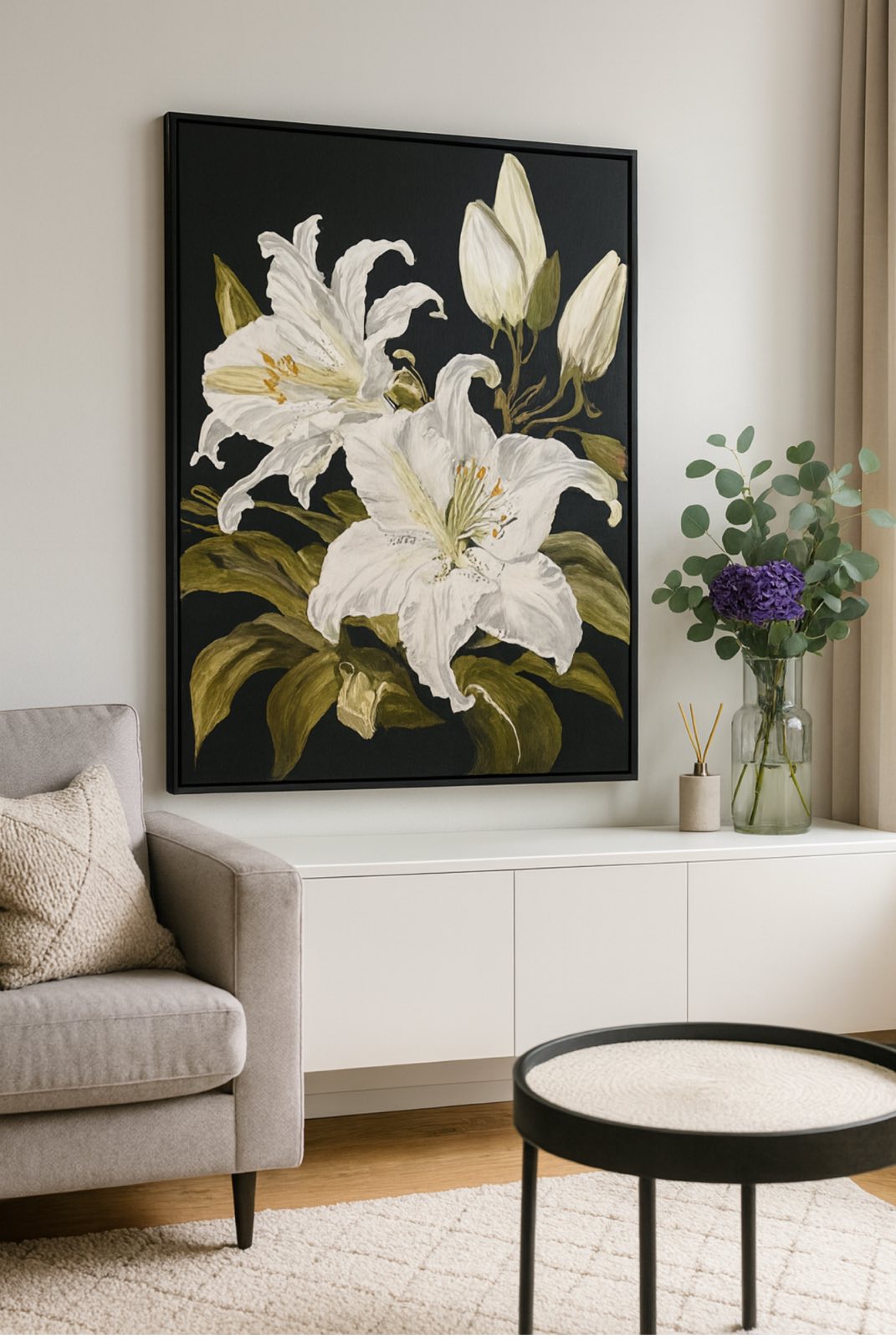 This elegant floral painting features luminous white lilies set against a deep, dark background, creating a striking contrast and a timeless sense of sophistication. The soft petals and gentle highlights bring a quiet glow to the composition, while muted green leaves add balance and natural depth.